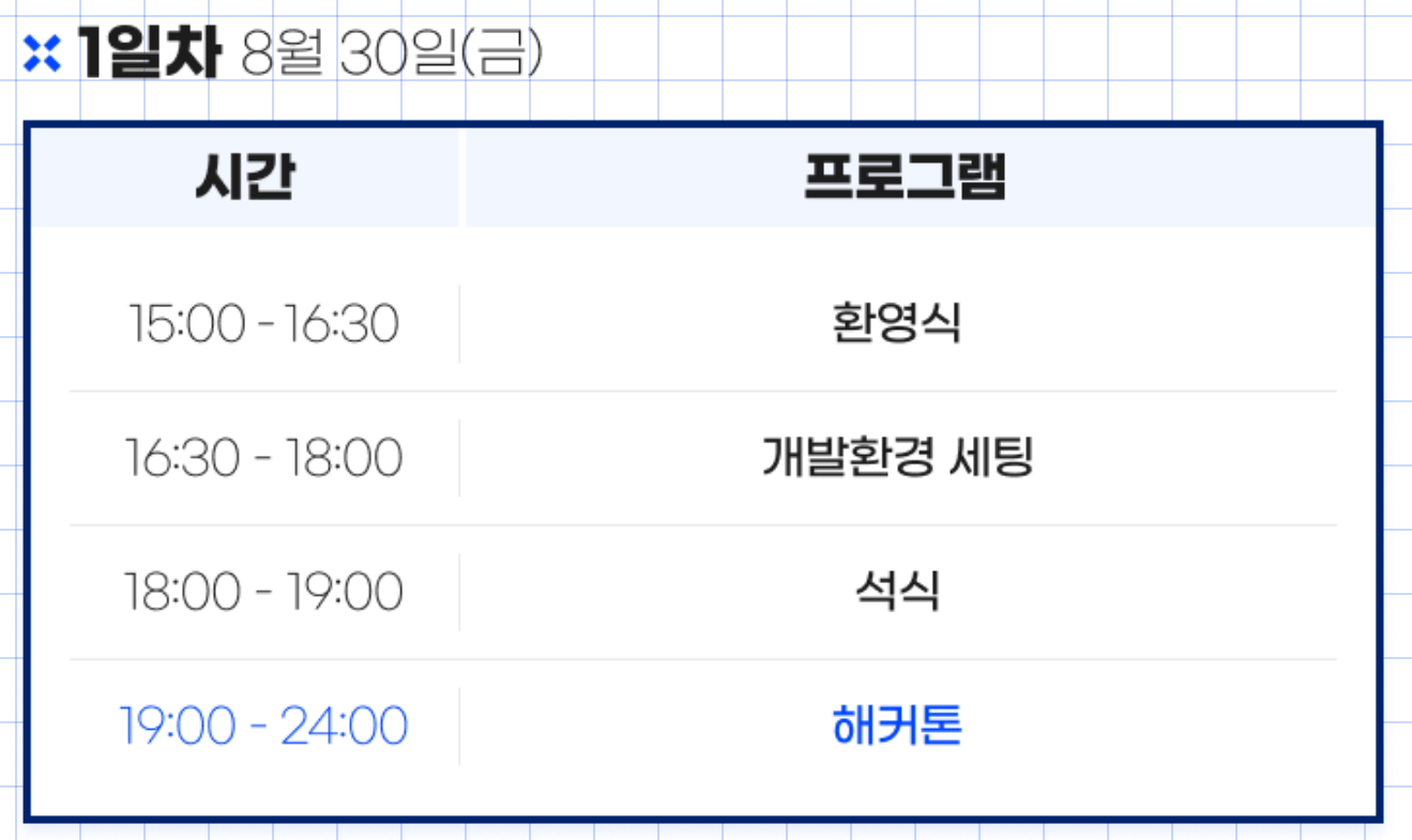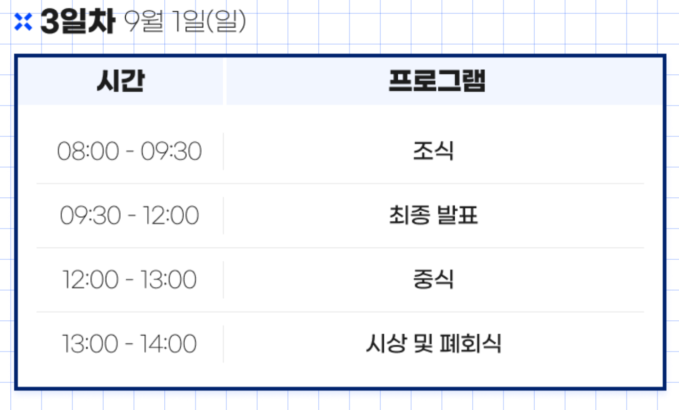 8/16 ~ 8/29์ ์จ๋ผ์ธ ๊ฐ๋ฐ๊ธฐ๊ฐ์ ๊ฑฐ์ณ 8/30(๊ธ) ~ 9/1(์ผ) 3์ผ๊ฐ ์ฐธ์ฌํ๊ฒ ๋์์ต๋๋ค.