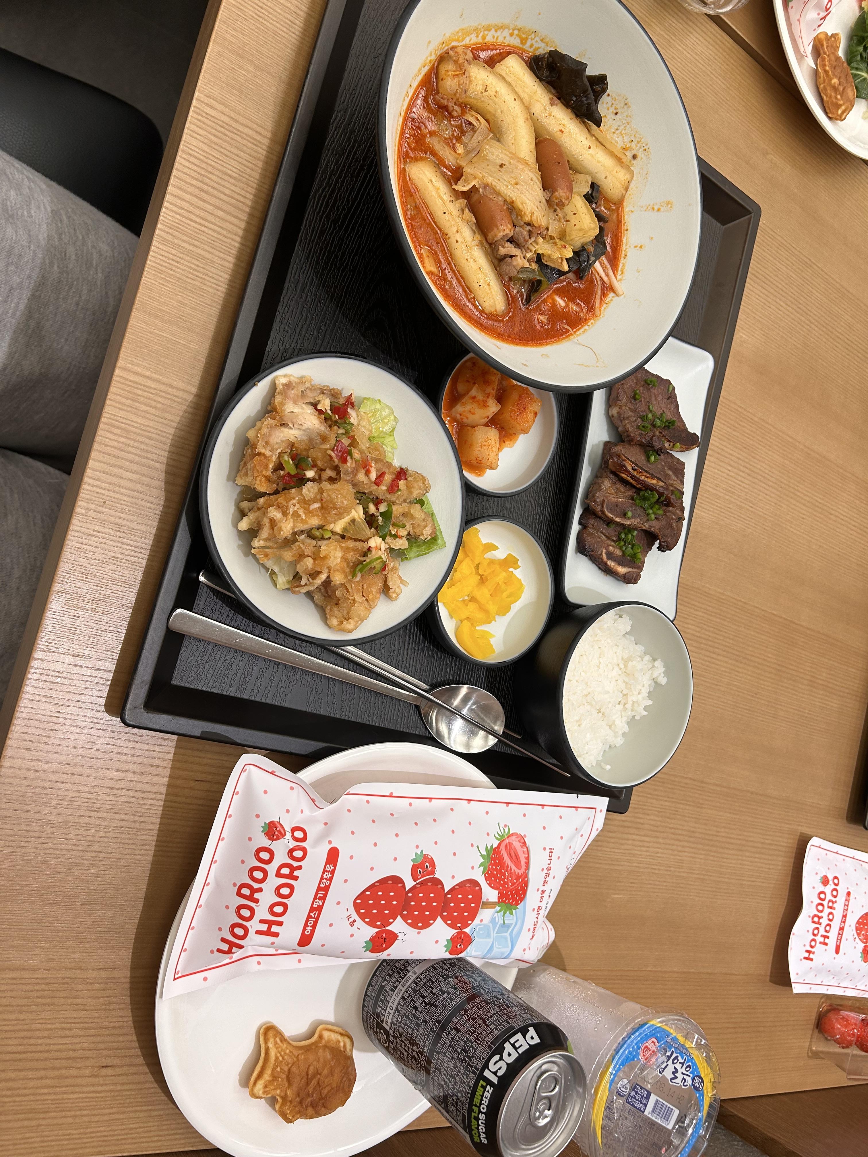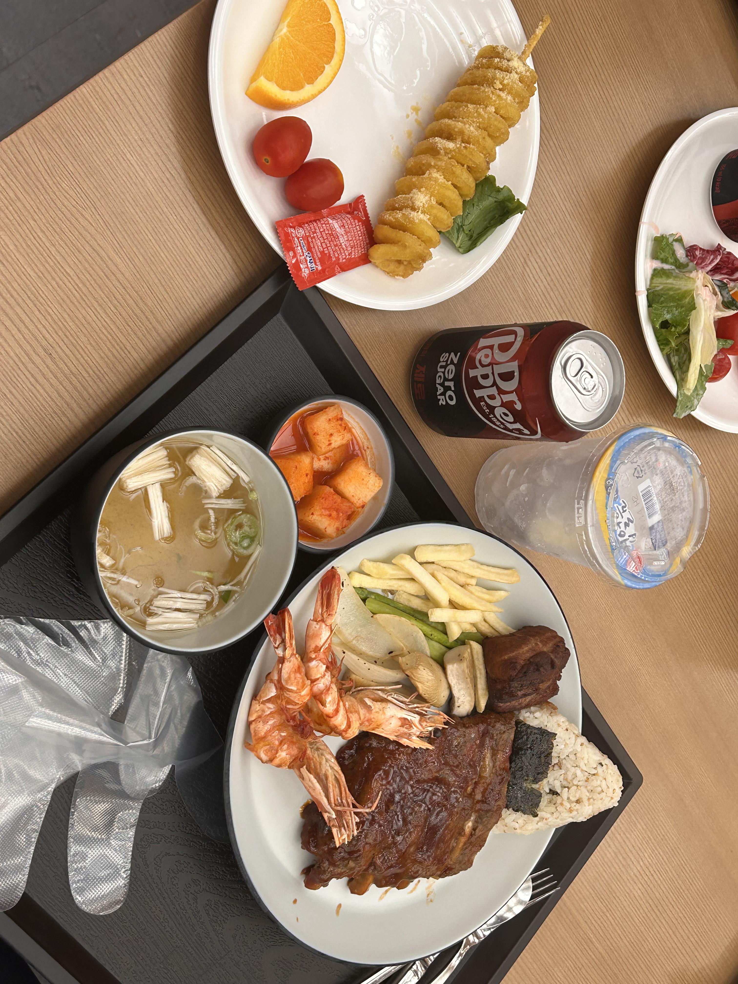 ์ฒซ ์์ฌ ๋ฉ๋ด๊ฐ ์คํ ์ดํฌ ๋ฎ๋ฐฅ + ์ ๋ณต ๋ฒํฐ๊ตฌ์ด + ๊น๋ง์ด/์ค์ง์ด ํ๊น + ์๋ + ๋ก๋ณถ์ด ๋ฑ๋ฑ