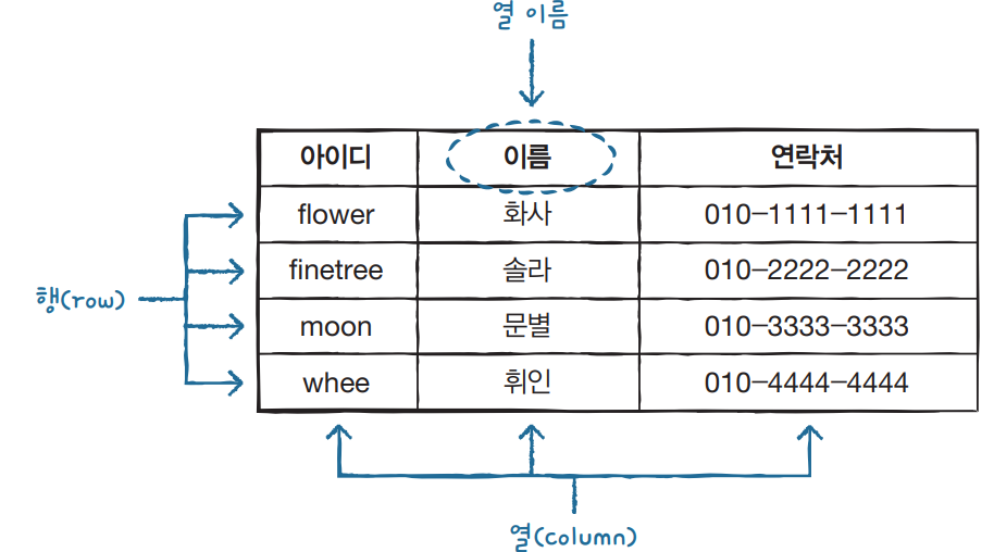 RDBMS์ ๋ฐ์ดํฐ๋ฒ ์ด์ค๋ ํ ์ด๋ธ(table)์ด๋ผ๋ ์ต์ ๋จ์๋ก ๊ตฌ์ฑ๋๋ฉฐ, ์ด ํ ์ด๋ธ์ ํ๋ ์ด์์ ์ด(column)๊ณผ ํ(row)์ผ๋ก ๊ตฌ์ฑ