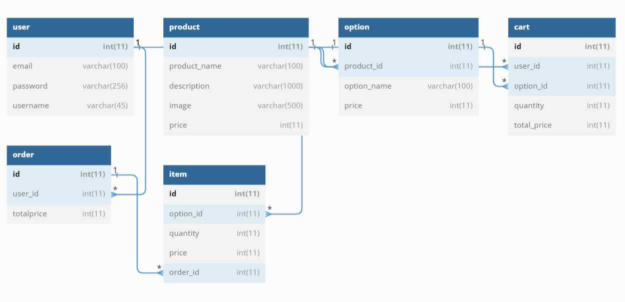 FK(Foreign Key)๋ฅผ ์ฌ์ฉํ์ฌ Product ํ ์ด๋ธ์ id์ ๋ถ๋ฌ์ ํ์ ์กฐ์ธํ์ฌ ์ ํ๊ณผ ์ต์ ์ ๋ฐ์ดํฐ๋ฅผ ํ๋ฒ์ ๊ฐ์ ธ์ฌ ๋ ์ฌ์ฉํ๋ ์ ์ฝ์กฐ๊ฑด(constraint)๋ฅผ ๊ฑธ์ด์ค๋ค.