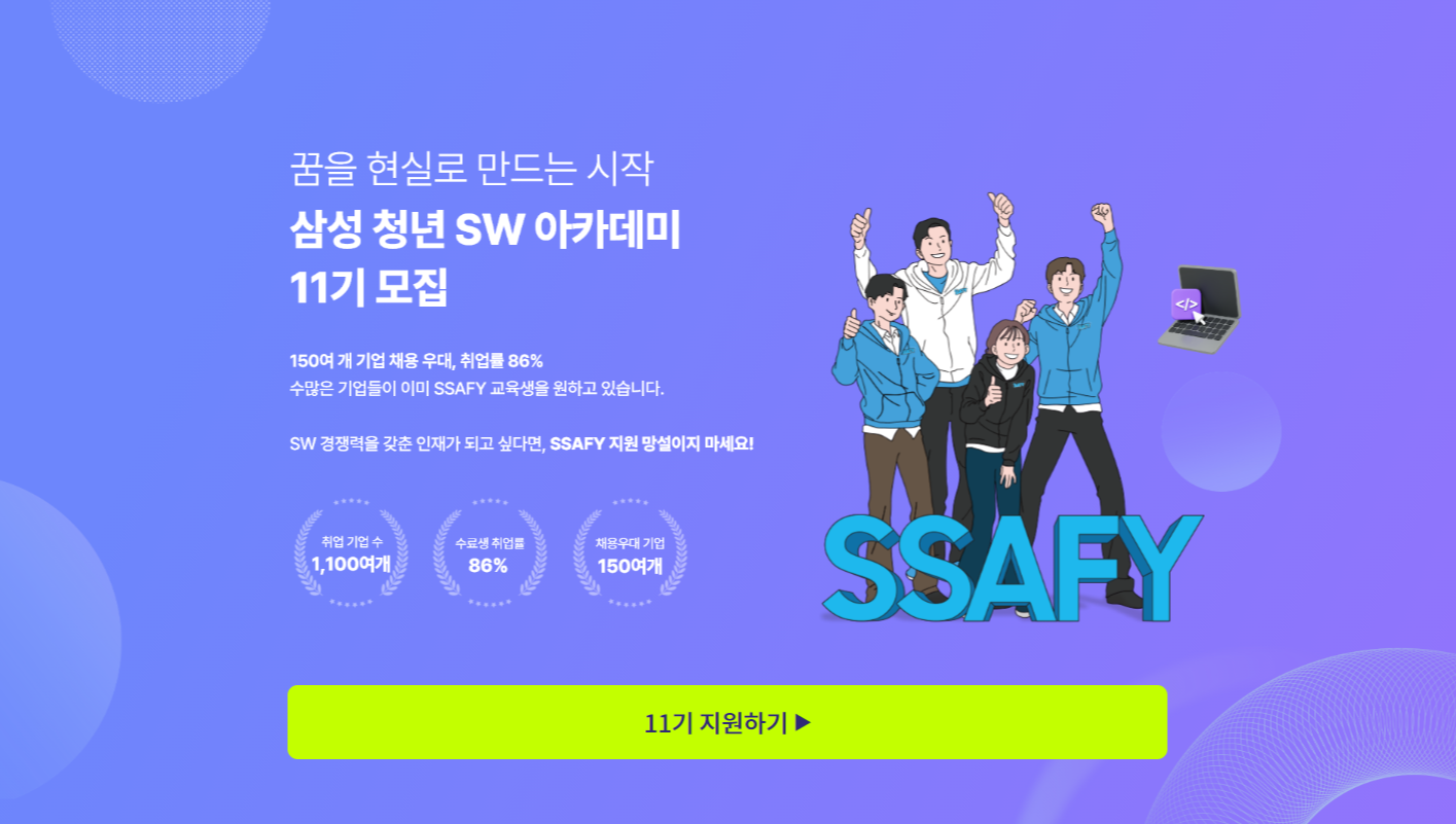 | [SSAFY] μΌμ± μ²λ SW μμΉ΄λ°λ―Έ 11κΈ° λͺ¨μ§ !! (0) | 2023.10.10 |