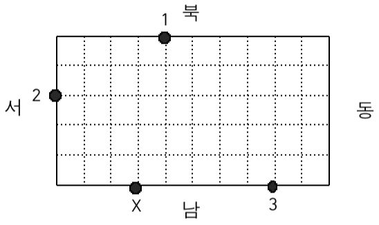 ์๋ฅผ ๋ค์ด ๊ฐ๋ก์ ๊ธธ์ด๊ฐ 10, ์ธ๋ก์ ๊ธธ์ด๊ฐ 5์ธ ๋ธ๋ก์ ๊ฒฝ๊ณ์ ๋ฌด์ธ ๊ฒฝ๋น๋ฅผ ์๋ขฐํ 3๊ฐ์ ์์ ์ด ์๋ค๊ณ ํ์. <๊ทธ๋ฆผ 1>๊ณผ ๊ฐ์ด ์ด๋ค์ 1, 2, 3์ผ๋ก ํ์๋์ด ์๊ณ , ๋๊ทผ์ด๋ X๋ก ํ์ํ ์์น์ ์๋ค.